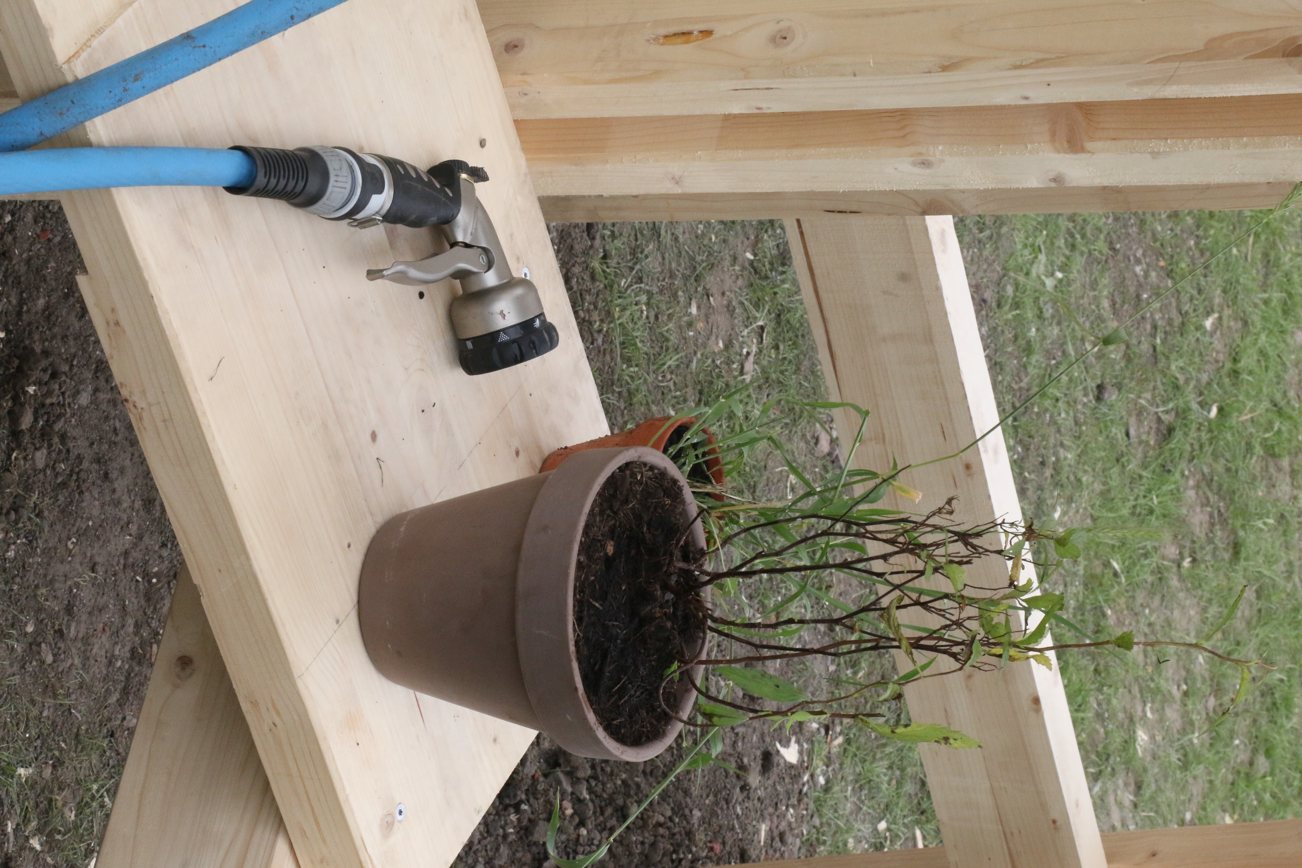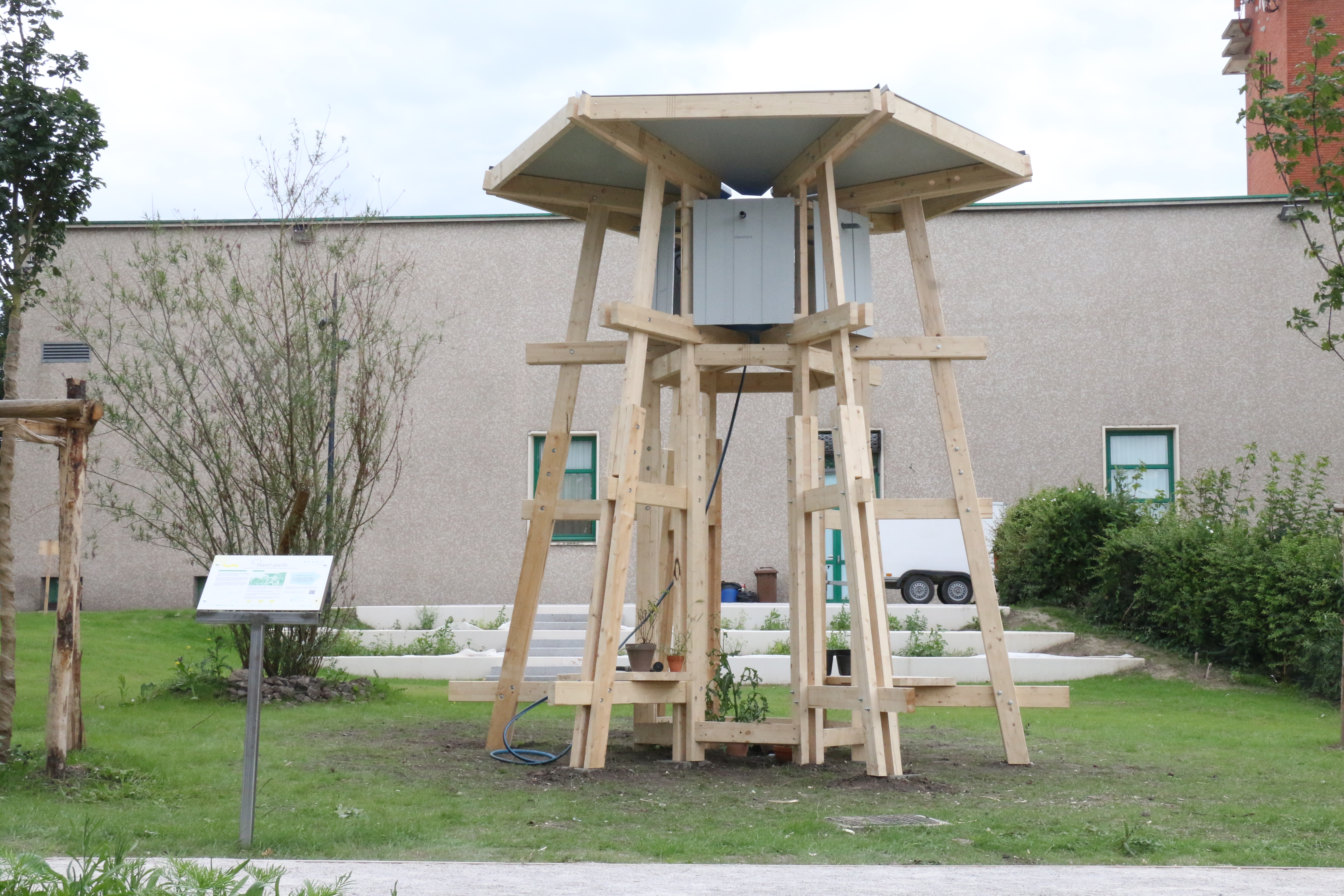 Formellement, c'est grâce à une structure en sapin, supportant une cuve de stockage d'eau de pluie, elle même alimentée en eau par une large toiture de panneaux d'aluminium composite que l'eau peut jaillir, par gravité, du tuyau d'arrosage placé sous la structure.