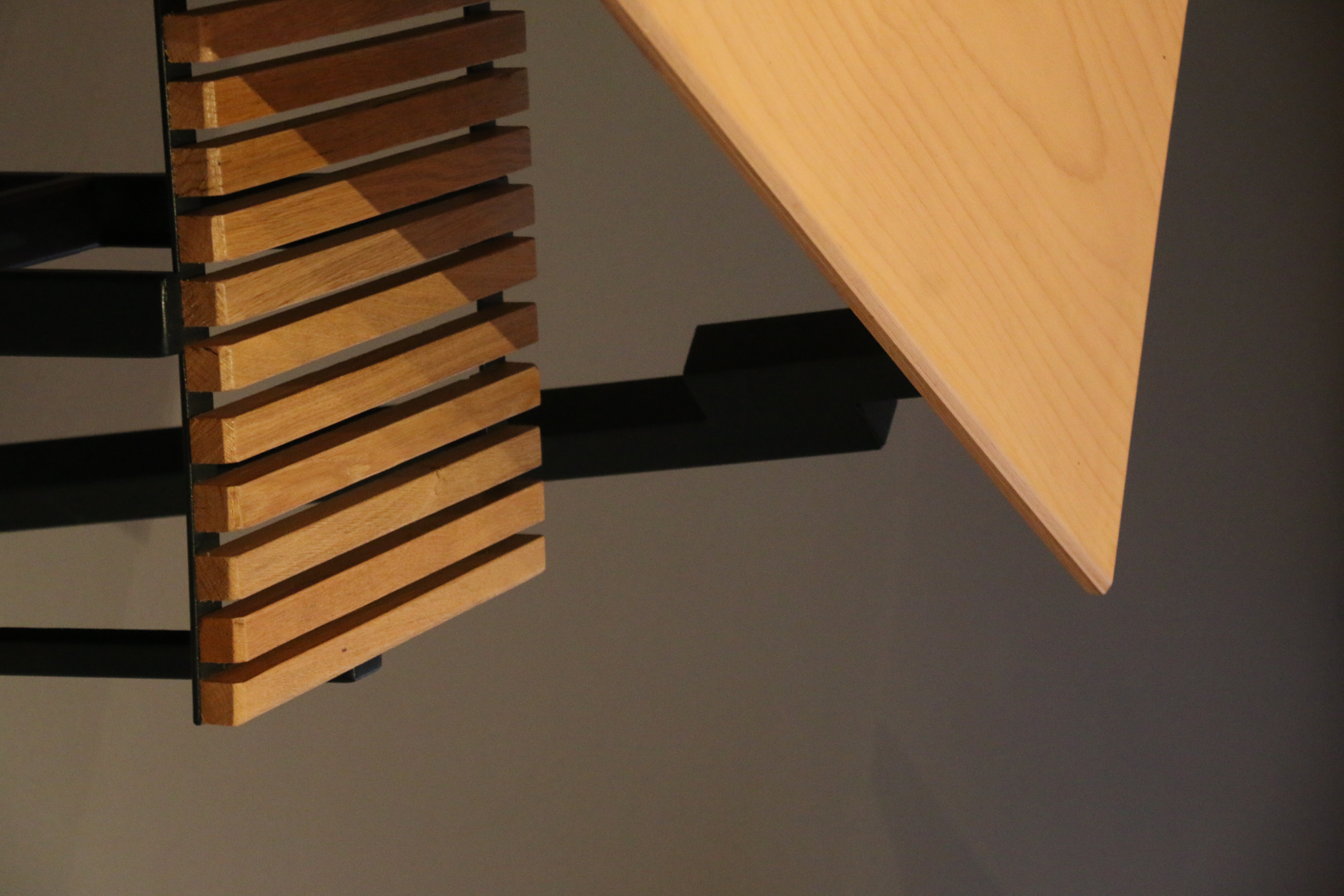 Encore une fois, la majeure partie des matériaux utilisées sont issus du réemploi : structures métalliques d'anciennes mains courantes d'un immeuble déconstruit par Reims Habitat, un bailleur social investit dans une démarche de réduction des déchets, des panneaux de bois de la Menuiserie de Champagne, une menuiserie d'agencement, et des tasseaux en chêne massif d'une tonnellerie de l'Aube, Obobois.