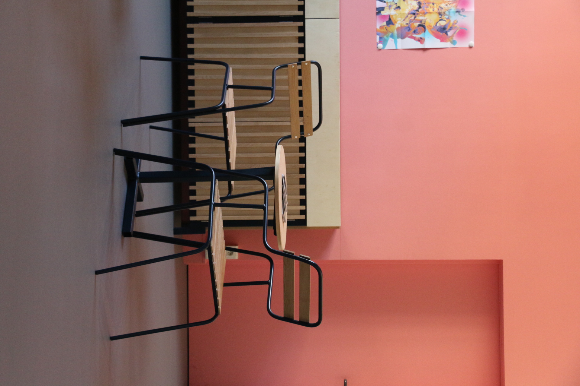 On y trouve ainsi une trentaine d'objets : tables, chaises, banquettes tapissées, grande vitrine d’exposition, bancs, tabourets hauts, tables basses, support mobile de documentation, tablettes...