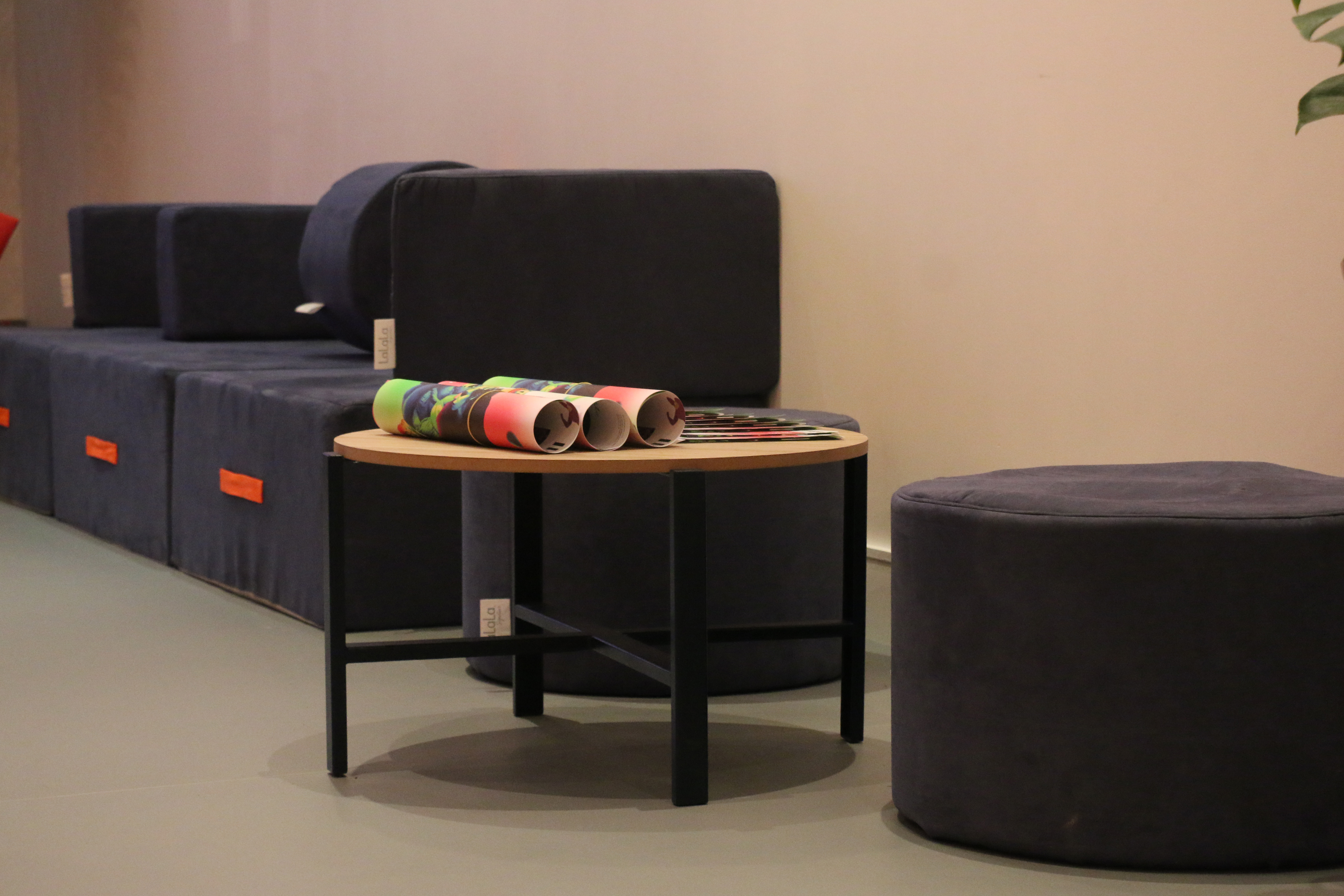 Enfin, un espace détente a été aménagé avec des assises en mousse tapissée, réalisés par Lalala Signature, qui offre une gamme de poufs aux formes contemporaines et modulables, réalisées ici encore en réemploi grâce à de la mousse industrielle et des textiles automobiles déclassés.