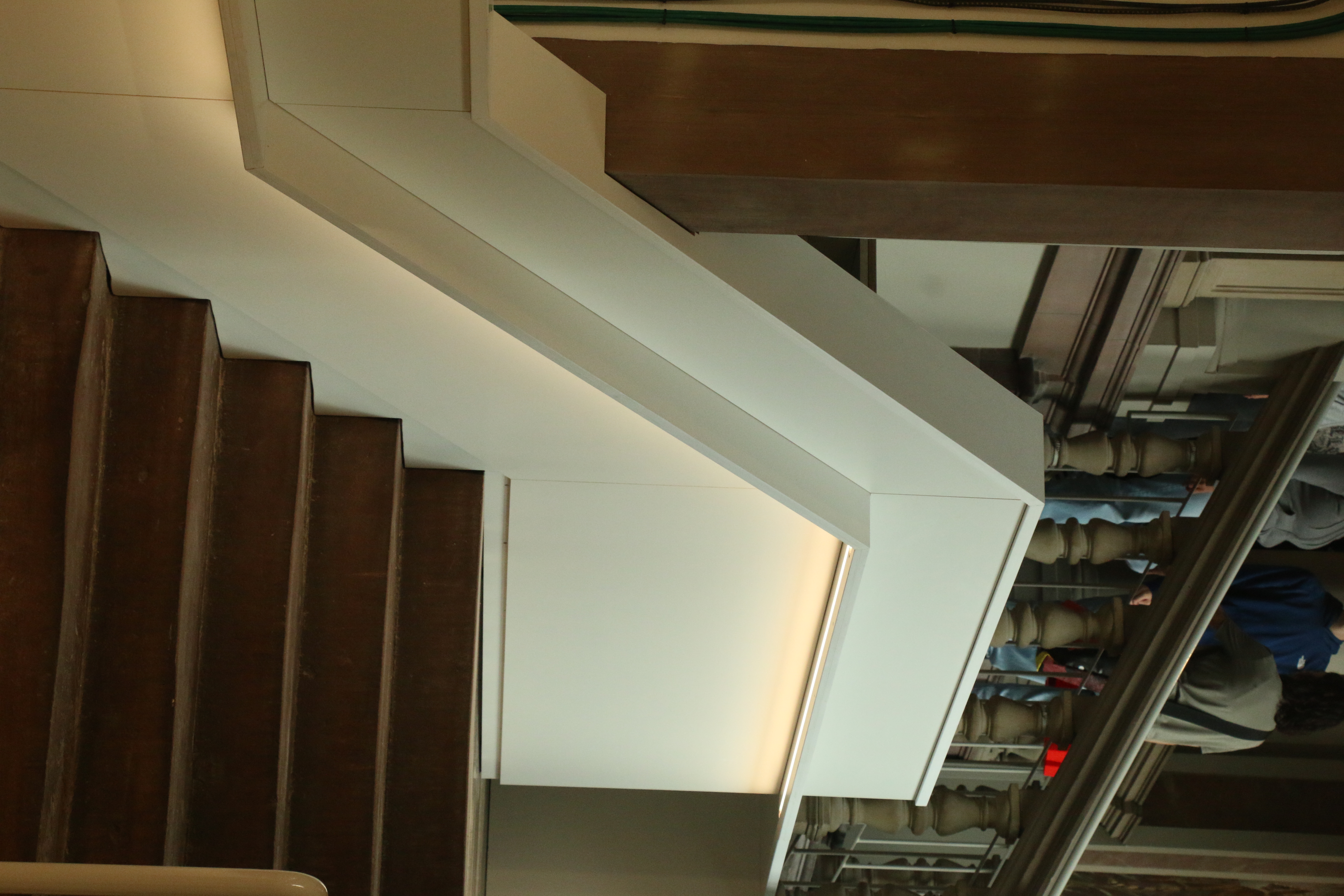 S’étalant entre deux niveaux et un escalier, cette grande borne de dix mètres linéiares contratse par son effet monolithique blanc avec l’espace d’accuil du musée.