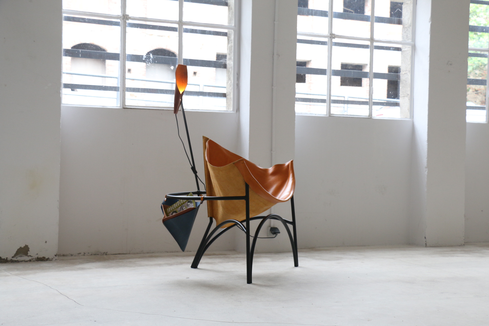 Pour ma part, j’ai été accuilli par l’entreprise Bandit Manchot, qui revalorise des cuirs mis au rebuts par l’industrie du luxe, pour confectionner de la maroquinerie et des objets simples et utiles. De cette immersion il en est résulté A Minima, une composition de trois objets issus du même procédé de mise en forme du cuir, réunis en un objet totem dédié à la lecture, à la détente et à la rêverie : un fauteuil, une lampe et un porte-revue