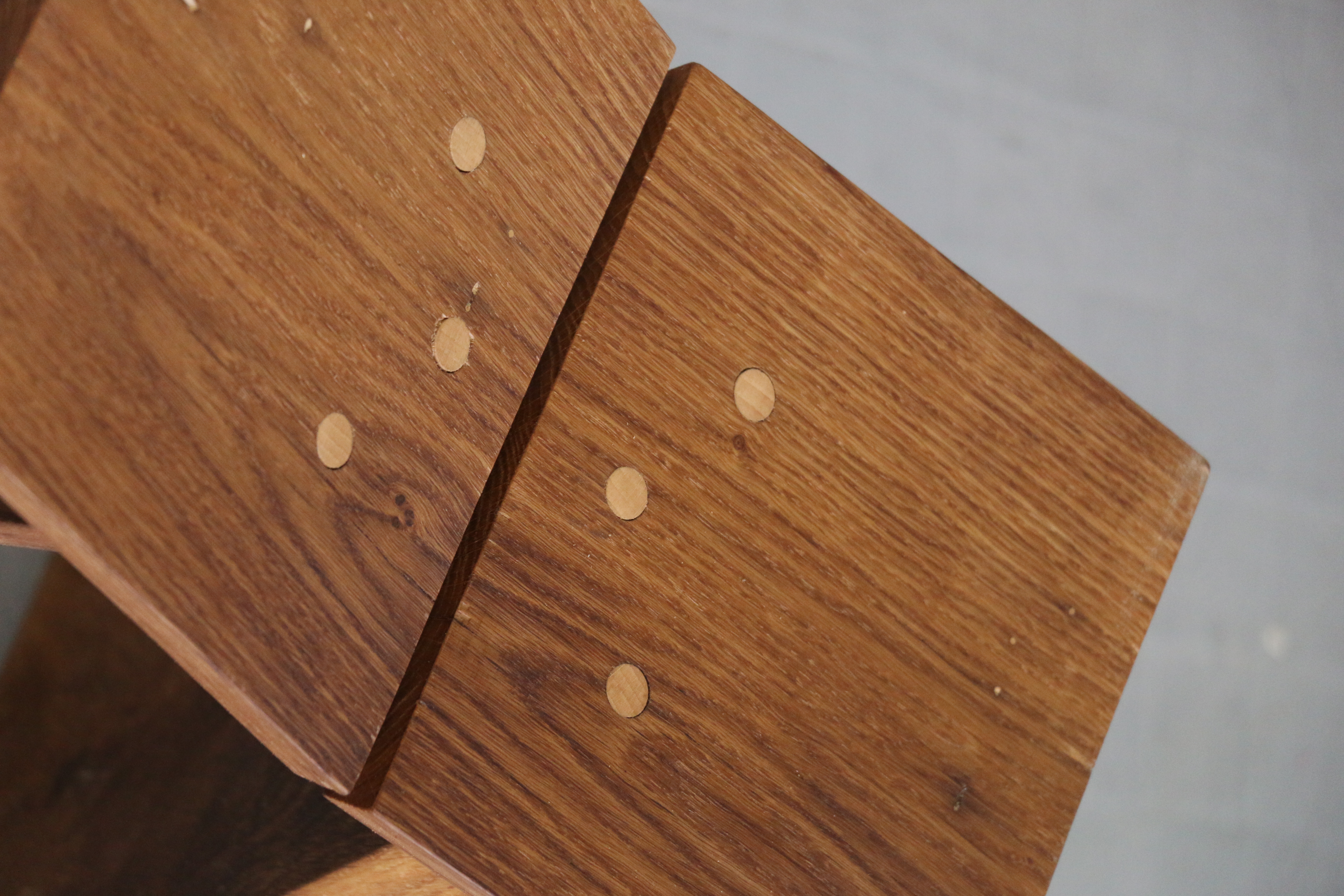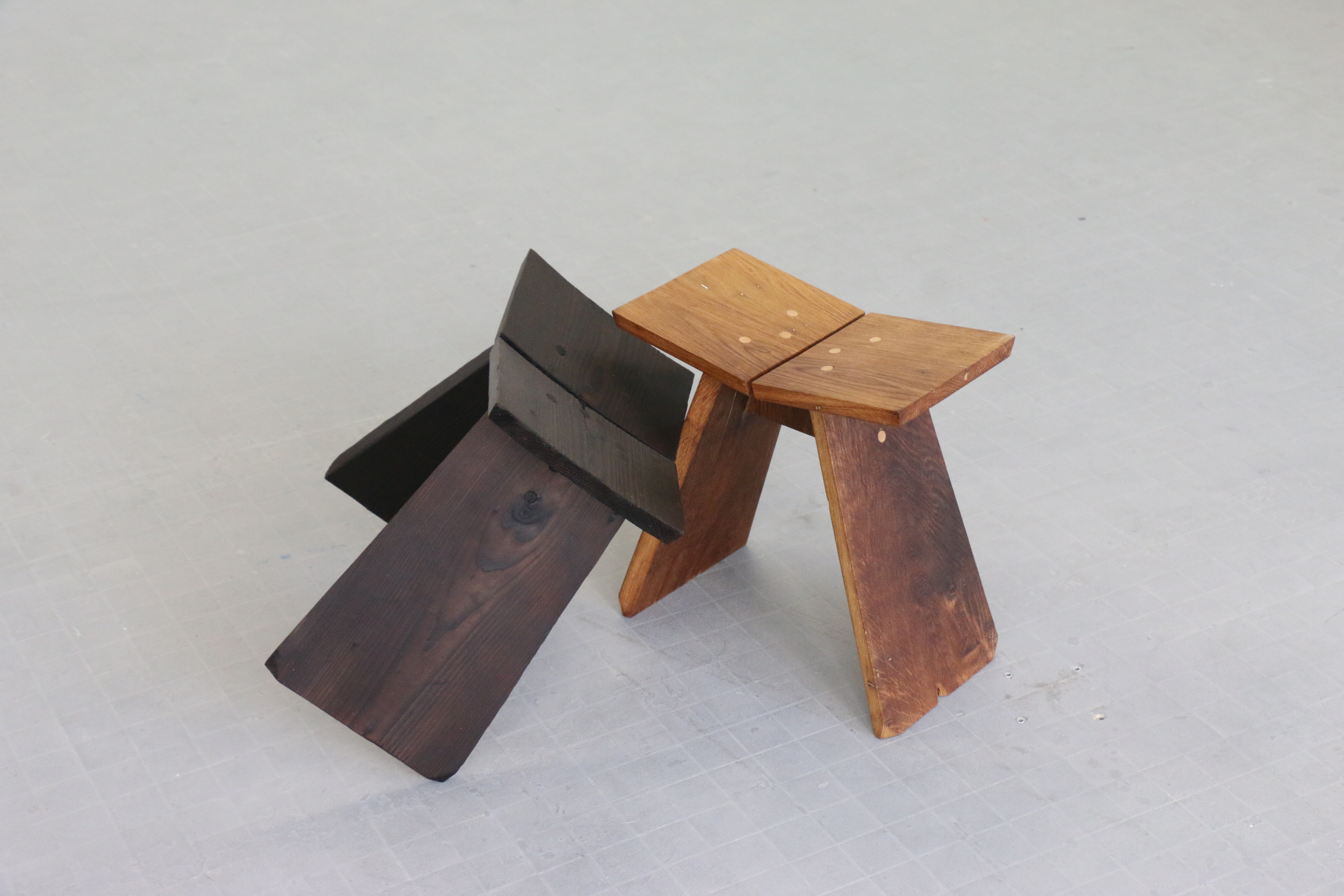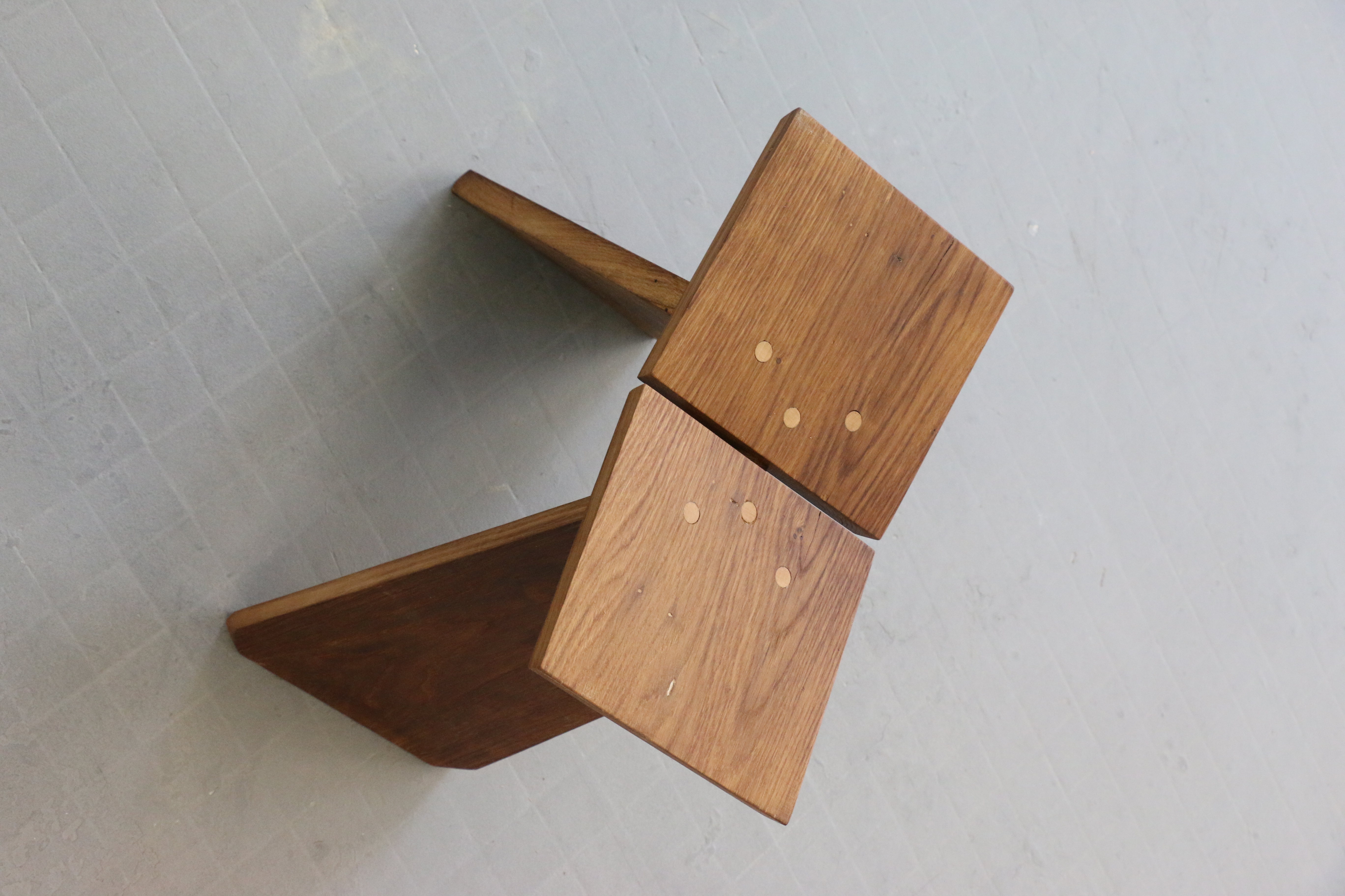 Réalisé en bois massif d'essences diverses, issus du réemploi d'éléments de construction (anciennes marches d'escalier en frêne, poutres en chêne…) ce tabouret allie donc recherche de l’équilibre et de l’harmonie des proportions, conception éco-responsable et réalisation traditionnelle pour allier confort, élégance et durabilité.